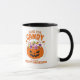 A abóbora engraçada iludiu a caneca de Halloween.