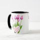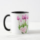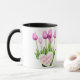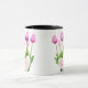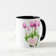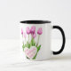 Buquê de Tulipas Cor-de-Rosa Dia de as mães Feliz Mug Esta caneca de café cerâmica apresenta um belo design de tulipas cor-de-rosa com a mensagem "Dia de as mães Feliz" escrita dentro forma cardíaca. É um presente perfeito e barato para a mãe mostrar seu apreço pelo Dia de as mães. Design: caneca floral, caneca buquê, caneca de tulipas rosa.