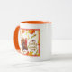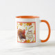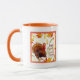Esta caneca do dois-tom tem as folhas de uma queda e o impressão agradáveis do peru com cartões de natal "da acção de graças feliz". Dentro do mostrado na laranja com punho alaranjado.
