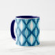 A caneca de café em um teste padrão moderno do diamante do meio século do marquise aninhado dá forma - a azul-céu azuis e claros médios da sarja de Nimes, com branco, e acentos escuros do marinho/índigo