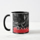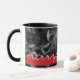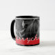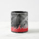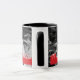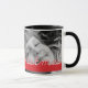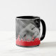 A foto do feriado agride, pelos red_dress, caracterizando as palavras, no branco, "Feliz Natal" (saídas do corte), impresso contra uma foto feita sob encomenda. A parte inferior desta caneca de café do Natal do divertimento tem um fundo vermelho brilhante.