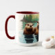 Uma família divertida de lontras gosta de um dia na água. Tetas bonitas e fofinhos nadando em um lago sereno. Tons felizes se divertindo em um cenário de floresta cênica. Uma imagem animadora de lontras se ligando na natureza. Aproveite uma xícara de café com esses adoráveis amigos da lontra.