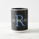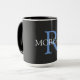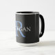 Personalize esta caneca preta de café com seu Monograma e Nome em Texto Azul e Branco. Clique em "Personalizar" para alterar cores e digitar estilos.