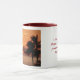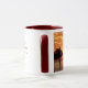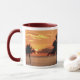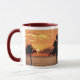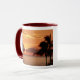 a caneca branca com borda vermelha e o punho, imagem do por do sol vermelho, alaranjado, amarelo dos trópicos com palmeiras, e do texto lêem: "Eu não tenho flashes quentes. Eu tenho férias privadas curtas nos trópicos."