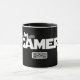 A caneca leva um design escuro para gamers