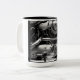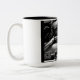 Uma fotografia preto e branco de uma grande caneca do motor muito limpo, brilhante do velomotor para o motociclista