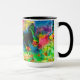 Minha cor de água original imprimiu em uma caneca do bebendo que caracteriza o grupo do arbusto de Omphalea em um fundo brilhante do por do sol visitado pelas traças do por do sol (Chrysiridia Rhipheus), que são nativas a Madagascar, África.