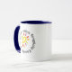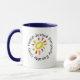 Uma caneca do Testimonial com um sol no centro com justiça das palavras, simplicidade, igualdade, unidade, paz é escrita em um círculo em torno de George Fox.