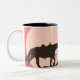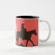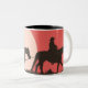 Obtenha suas botas sobre na manhã com esta caneca ocidental do estilo, caracterizando as silhuetas do vaqueiro e dos cavalos contra um por do sol vermelho.