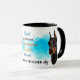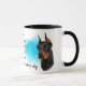 Um belo retrato de um cachorro-preto-e-bronzeado de Doberman Pinscher é a característica em dois lados desta caneca. Cada imagem é colocada sobre um fundo azul brilhante de filtro. Entre as duas imagens está o texto que descreve esse companheiro leal e corajoso, com "o cão DOBERMAN PINSCHER" em preto no fundo. Todo o texto é facilmente personalizado para qualquer coisa que você preferir; descreva seu próprio amigo leal!