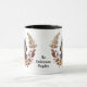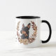 Uma bonito coroa de outono em tons de cinamão marrom, bronzeado, e creme rodeiam a imagem aquosa de um lindo Cão Doberman Pinscher. A imagem é impressa duas vezes na caneca, com seu texto personalizado entre eles.