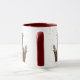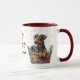 "O filhote doberman conserta tudo" declara esta caneca para o dono do cachorro Doberman Pinscher. A imagem em cada lado é um retrato de um filhote doberman adorável em uma cesta mais vadia. As imagens e o texto são colocados sobre um fundo branco que é aspergido com um confete dourado.