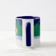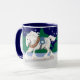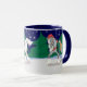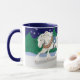 cavalos de esboço cinzentos ilustrados. Em um lado um clydesdale com um chapéu e uma barba do papai noel carrega as bolsas dos presentes. No outro os galope majestosos de um esboço com sinos de Natal em seu colar e em uma pomba do branco projetam em sua sela. Cena do inverno com árvores de Natal e céu nocturno estrelado atrás. Uma caneca bonita do feriado para amantes do cavalo.