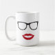 Esta caneca moderna faz um grande presente para alguém com um sentido de humor. Caracteriza a silhueta dos eyeglasses e dos lábios vermelhos. Design na moda que fará uma parte de conversação. Emparelhe-o com os vidros do olho e a caneca do bigode e faça-lhe um grande presente para um casal, um noivado, um aniversário ou um dia dos namorados. É igualmente excelente para um caixeiro do desenhista, do blogger, do secretário ou de escritório.