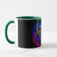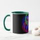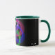 Modern 3D circular inspired double loop mesh geometric custom coffee mug. Unique features include a colorful design, custom text and additional mug color options.