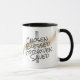 Uma cruz prateada fica em frente a uma espiral de brilho falsa de ouro. Sobre a cruz está o texto a preto que diz "Escolhido Abençoado Perdoado Salvo". A imagem com texto é repetida do outro lado da caneca.