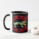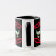Dois dragões com escamas verdes e brancas no corpo, espinhos dourados e vermelhos na cabeça, língua vermelha. Bordado na parte superior e inferior com elos de corrente vermelha em um fundo preto.