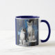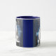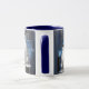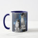 Mug em dois gatos sentados graciosamente contra um fundo azul profundo, abstrato. As texturas realistas de pelo com ousada linhagem e elementos geométricos criam uma atmosfera moderna e surreal. Seus olhos amarelos expressivos contrastam impressionantemente com os arredores legal.