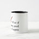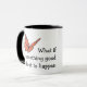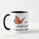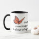 Uma caneca de café branca com fotografia de uma borboleta monarca e o ditado "E se alguma coisa boa está prestes a acontecer?" Faça alguém feliz. Anime um amigo. Encoraje-se com cada gole. Parem com o pensamento negativo!