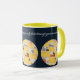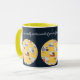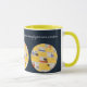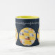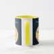 Caneca azul escura com padrão circular amarelo. Lugar perfeito para sua cozinha, presente perfeito para amantes de estilo abstrato e urbano e para aqueles que querem encontrar beleza na vida cotidiana. Você pode substituir o texto "Você realmente não vê o mundo se você só olhar pela sua própria janela" pelo seu próprio texto.