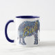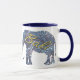 Azul branco e marinho 11 oz. Ringer combo mug com uma imagem, de ambos os lados, de um elefante batik azul estrelado à noite. A palavra "Bali" é impressa em dourado e é opcional. Veja o vidro de tiro correspondente. Veja toda a coleção Bali Retreat Mug na COMIDA/BEV| Seção Pratos.