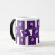 The coffee mug features fine art macro photography of a portrait of a blooming pink spring flower, highlighting beautiful details of the floral petals and sepals, on a purple background. The photograph represents the soft beauty of spring blossoms.