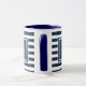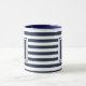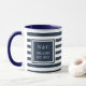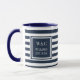 Caneca de iniciais personalizadas e modernas com monograma, apresentando um padrão de faixas azuis marinho e branco com suas iniciais e nome da família com a data de estabelecimento definida em um quadrado com borda azul marinho e texto branco clássico. Criado por Thisisnotme©
