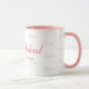 Uma design simples e moderna em uma caneca branca e rosa (cores e estilos personalizados) com seu nome escrito à mão e texto personalizado (um slogan, uma mensagem para alguém especial, uma profissão...)