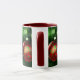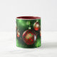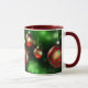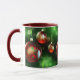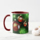 Imagem de Enfeites de natal vermelhos ricos decorados com ouro artístico e corrimão verde, enquanto penduram em fita verde diante de um fundo abstrato de verde e luzes de Natal. Faça sua caneca matinal uma feliz!