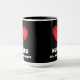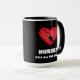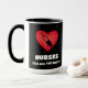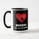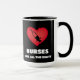 Aqui está uma caneca que qualquer enfermeira adoraria ter seu café. Este design tem um coração vermelho com um tiro e um texto que diz "ENFERMEIRAS CHAMAM TODOS OS TIROS". A alça e o dentro da caneca são pretos.