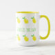Caneca branca e amarela de duas tonalidades com limões e o texto "Aperte o dia!" em uma fonte fofa e branca. O perfeito elogio dizendo para começar o dia certo!