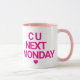 Texto cor-de-rosa escuro na Taça de Café Branca e Rosa.Comece suas manhãs com um sorriso usando esta caneca "C U Próxima Segunda-feira", projetada com letras em negrito em bloco rosa em uma caneca branca limpa com alça rosa e interior correspondentes. Esta design assustadora e pesada é perfeita para aqueles que apreciam o humor com um pouco de atitude. Excelente como presente de vadia, xícara de café de escritório ou picape pessoal, esta caneca adiciona uma declaração ousada a qualquer ritual de cafeína. Não pelo fraco do coração, este é pelo ousado e sem desculpas.