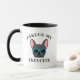 Esta engraçada caneca de café de cachorrinho francês faz o presente perfeito para amantes frênicos com senso de humor. A design apresenta uma ilustração ao estilo de desenho animado de um buldogue francês de cor azul vestindo óculos de sol com a frase "Perdão meu francês". O design é o mesmo em ambos os lados da caneca.