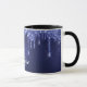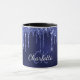 Uma caneca de moda e moda. Um fundo azul-marinho chic decorado com pingos de brilho sujo, aparência de pingar tinta. A cor azul é irregular. Personalize e adicione um nome e iniciais de monograma. Letras azuis e brancas coloridas. O nome é escrito com um moderno estilo escrito à mão.