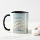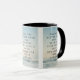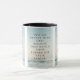 Esta caneca de dois tons apresenta uma fonte lora com letras negras mostrando o verso da Escritura de bíblia "Eclesiastes 4:9 KJV" sobre uma imagem de fundo mostrando um cobrir de nuvem com tons escuros visto de cima sob um céu azul claro mais o aspecto de cor dupla com um tema de nuvem acima. Este verso está referindo o 4º capítulo do Livro de Eclesiastes mostrando o 9º verso neste tema de citação de escrituras bíblias do Rei James bíblia. A jante e o manípulo são vidrados em cores compatíveis, disponíveis em micro-ondas e máquinas de lavar louça de tamanho 11 onças ou 15 onças, construindo cerâmica segura.