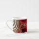 Um design fractal cintilante com espirais ornamentadas de vermelho escuro e vibrante, sobreposto com filigrana dourada como conchas metálicas e adornado com rubis cintilantes.