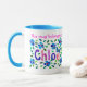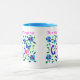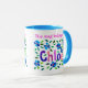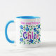 Uma caneca branca, com jante azul em pó e alça, decorada com uma colagem de papel pintada a mão floral e a menção "This Mug Pertence a Chloe". Lavadora de louça e micro-ondas seguras.