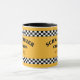 Personalize esta caneca de café de táxi com estilo táxi amarelo do verificador com o seu texto. Seja Schnauzers em NYC, franceses em Paris, ou Terriers em Boston. Todo o texto pode ser personalizado para o seu cão ou gato favorito ou qualquer outra coisa que você queira expressar no estilo de táxi do verificador. Um pop de cor amarela clara e listras de tabuleiro de xadrez é uma maneira excelente de começar o dia no estilo da cidade retrornostálgica. Bipe! O texto de exemplo na imagem é Schnauzer Cab Co NYC, mas cada linha pode ser personalizada.