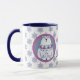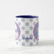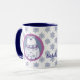 Aqui está uma linda caneca de Natal personalizada que crianças e adultos podem apreciar. Um lado apresenta uma ilustre imagem nórdica de bonitinho de neve no centro de um fundo de cinza azul que é enquadrado em cor-de-rosa lavanda. O outro lado tem urso polar na mesma faixa de círculo. As imagens emolduradas são colocadas sobre um fundo correspondente de floco de neve azul e branco, com seu texto personalizado em azul marinho entre as imagens.