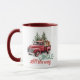Esta ilustração de Natal ao estilo vintage tem um caminhão vermelho retrô, árvores verdes, e o texto Jingle All the way.