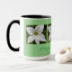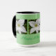 Uma linda caneca de bebida para alguém que ama flores. Talvez você seja um hobby de jardim ou está comprando um presente para alguém que seja. Esta caneca é o presente perfeito com este conjunto de flores brancas com um fundo verde. A caneca tem um interior preto e uma alça. Peça simples, mas eficaz.
