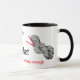 Esta caneca branca é decorada com imagens negras e brancas de pele de lã, cada uma com dois ganchos vermelhos de crochê e a palavra "Eu crochê porque tricô não é excitante o suficiente". É uma caneca humorística para dar a alguém que ama crochê, e pode ser personalizado com qualquer nome.