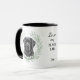 "LOVE MY BLACK LAB" declares this mug for the Labrador Retriever dog owner. Each side of the mug has a watercolor portrait of a beautiful black Lab framed by soft green watercolor eucalyptus leaves. Between the two images is the text, which may be easily customized, or even removed by you, and your monogram or name.