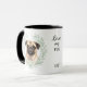 "LOVE MY PUG" declares this mug for the Pug dog owner. Each side of the mug has a portrait of an adorable fawn colored Pug framed by soft green watercolor eucalyptus leaves. Between the two images is the text, which may be easily customized, or even removed by you, and your monogram or name.