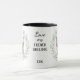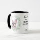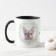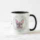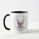"LOVE MY FRENCH BULLDOG" declares this mug for the Frenchie owner. Each side of the mug has an adorable portrait of a gray white French Bulldog framed by soft green watercolor eucalyptus leaves. Between the two images is the text, which may be easily customized, or even removed by you, and your monogram or name.