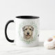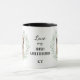 "LOVE MY IRISH WOLFHOUND" declares this mug for the Wolfhound dog owner. Each side of the mug has a portrait of a gray and white Irish Wolfhound framed by soft green watercolor eucalyptus leaves. Between the two images is the text, which may be easily customized, or even removed by you, and your monogram or name.