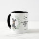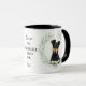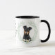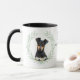 "LOVE MY MANCHESTER TERRIER DOG" declares this mug for the Manchester Terrier dog owner. Each side of the mug has a portrait of an adorable black and tan Terrier framed by soft green watercolor eucalyptus leaves. Between the two images is the text, which may be easily customized, or even removed by you, and your monogram or name.