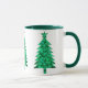 Mug numa silhueta clássica de uma árvore de Natal em verde-pinheira-escura / verde-esverdeado, com flocos de neve geométricos em verde-pastel, aqua e azul-gelo