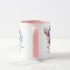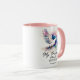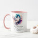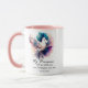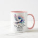 Uma caneca de café cristã com uma escritura de citação inspiradora retrata uma bela pomba branca voando pelo céu, suas asas adornadas com salpicos azuis e lavandas de tinta. Ele apresenta uma Bíblia encorajadora do Verse Exodus 33:14, "Minha Presença vai com você, e eu te darei descanso."