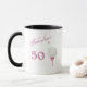 Sabe que ela é fabulosa aos 50, e esta caneca vai lembrá-la disso! Ele apresenta seu texto personalizado estilizado em rosa escuro, que diz FABULOUS AT 50. Do lado está um taco de golfe rosa que combina com uma imagem de bola de golfe. O texto e a imagem são colocados em um fundo de imagem de confete dourado, o que adiciona interesse e um pouco de borra. A imagem é repetida do outro lado, com seu nome ou outro texto personalizado em cinzas suaves entre eles. Perfeito para qualquer mulher que goste de golfe, e está virando os 50!